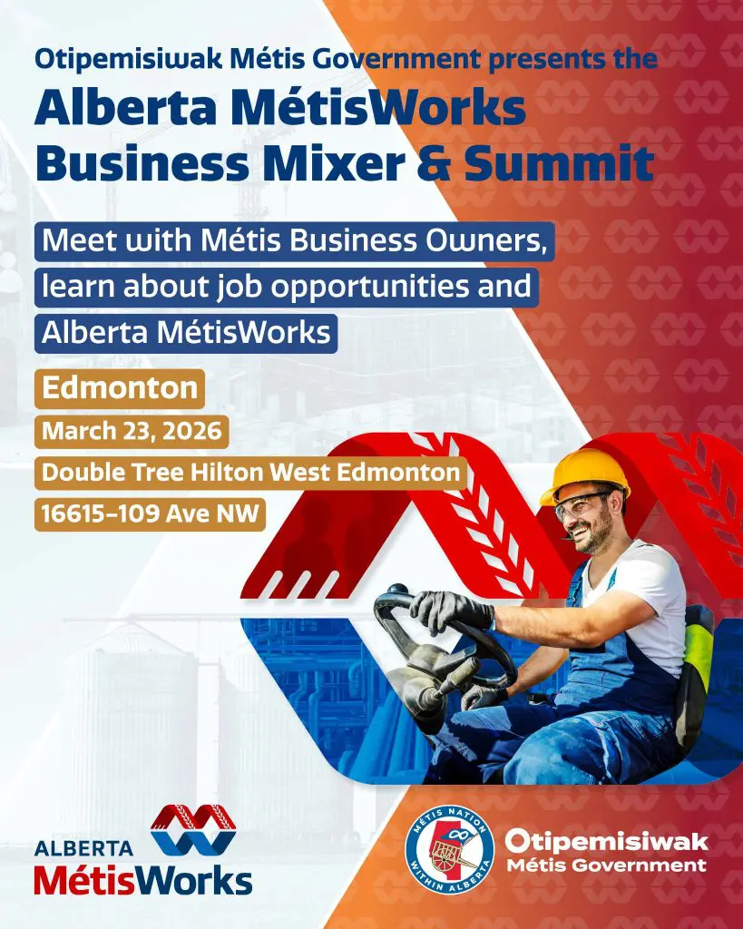 You are invited to the Alberta Métis Works Business Mixer & Summit presented by the Otipemisiwak Métis Government on March 23, 2026 at DoubleTree Hilton West Edmonton!