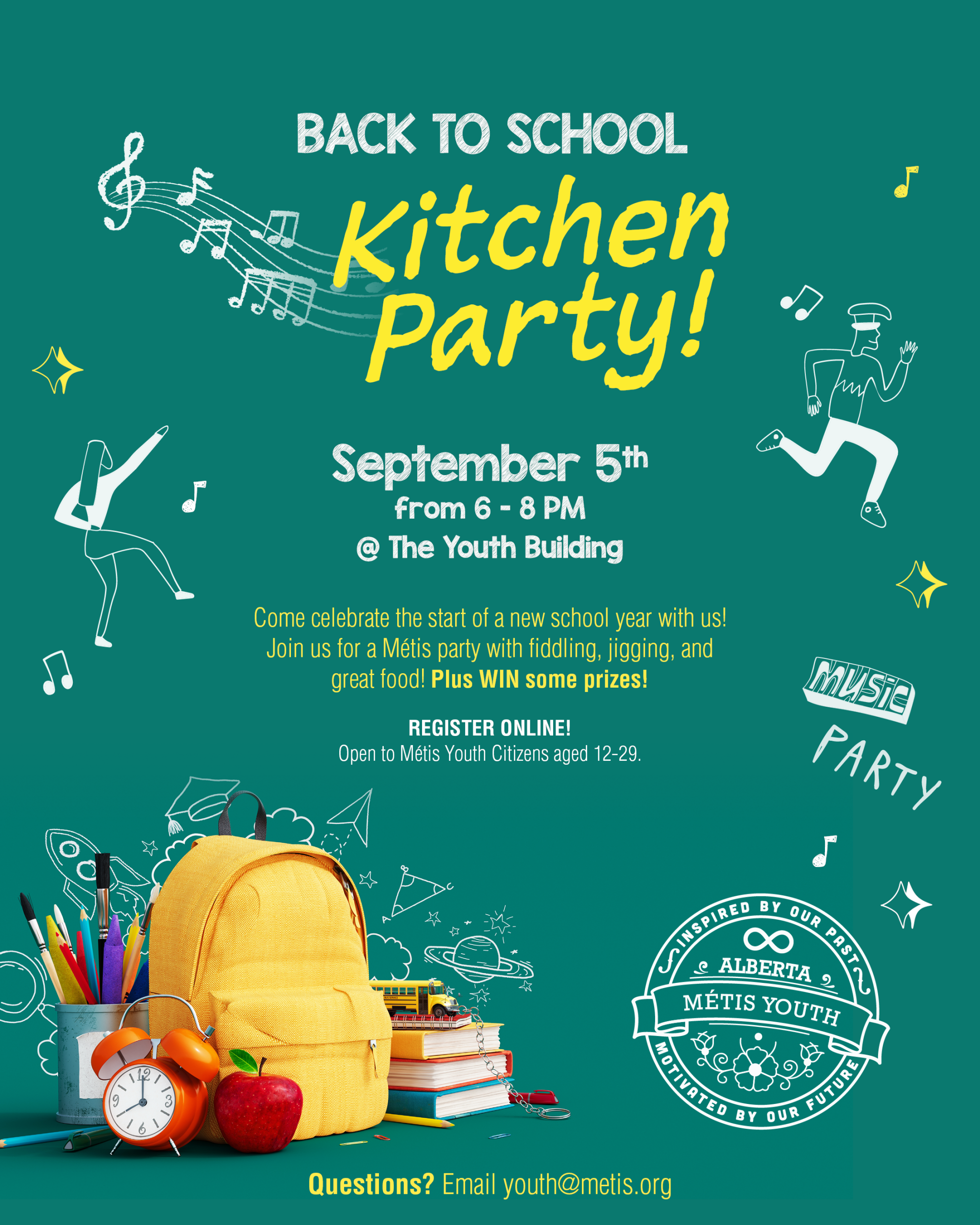 Come celebrate the start of a new school year with us! Experience a traditional Métis party with fiddling, jigging, and beef stew (vegetarian option will be available)! You’ll also have the chance to win some cool door prizes and customize your own pencil case!