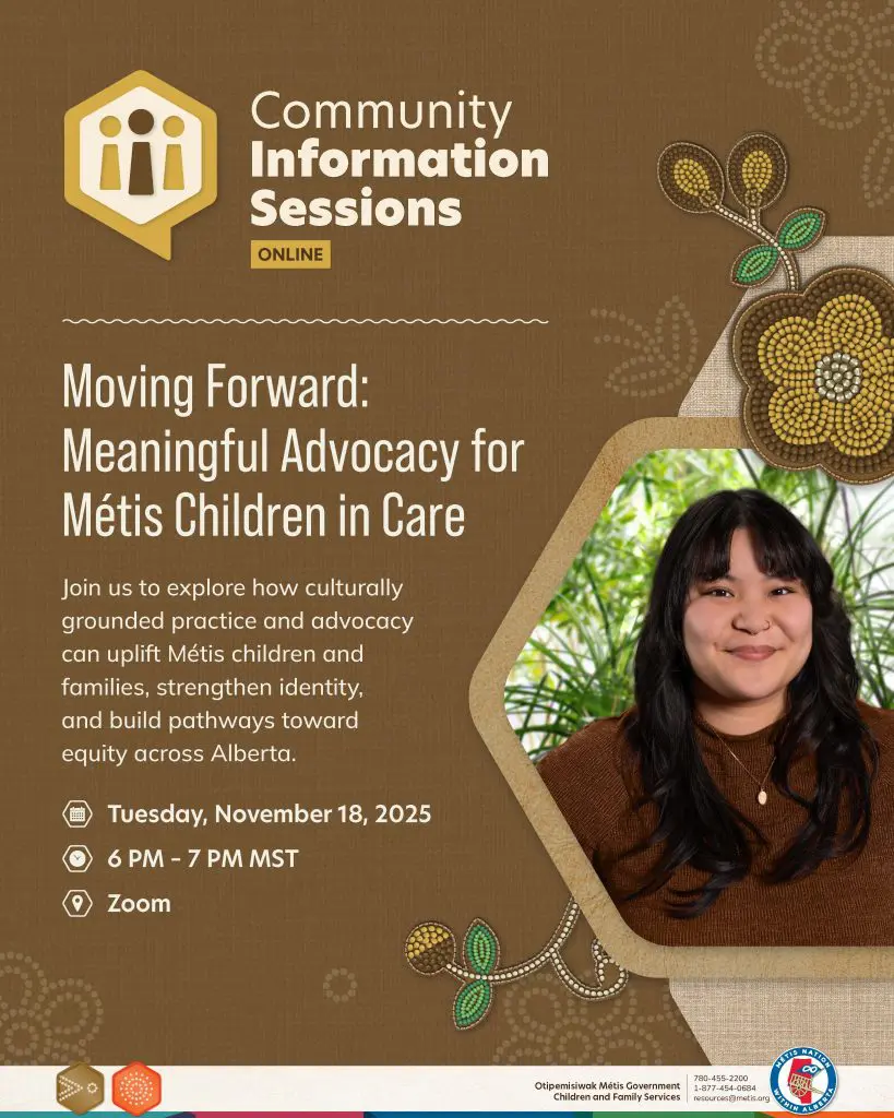 Join us for a special online Community Information Session as we explore how culturally grounded practice and advocacy can uplift Métis children, youth and families, strengthen identity, and build pathways toward equity across Alberta.