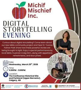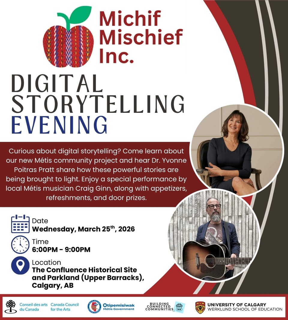 We invite you to join us for an evening of Métis Digital Storytelling at The Confluence as Michif Mischief Inc. shares an exciting new project focused on creating digital stories of Métis people in Southern Alberta. Dr. Yvonne Poitras Pratt will offer a behind-the-scenes look at the creative process and share insights into how these meaningful stories are brought to life. During the evening, enjoy a special musical performance by Métis artist Craig Ginn, along with appetizers, refreshments, and door prizes. This will be an evening of story, connection, and community as we celebrate Métis voices and experiences.