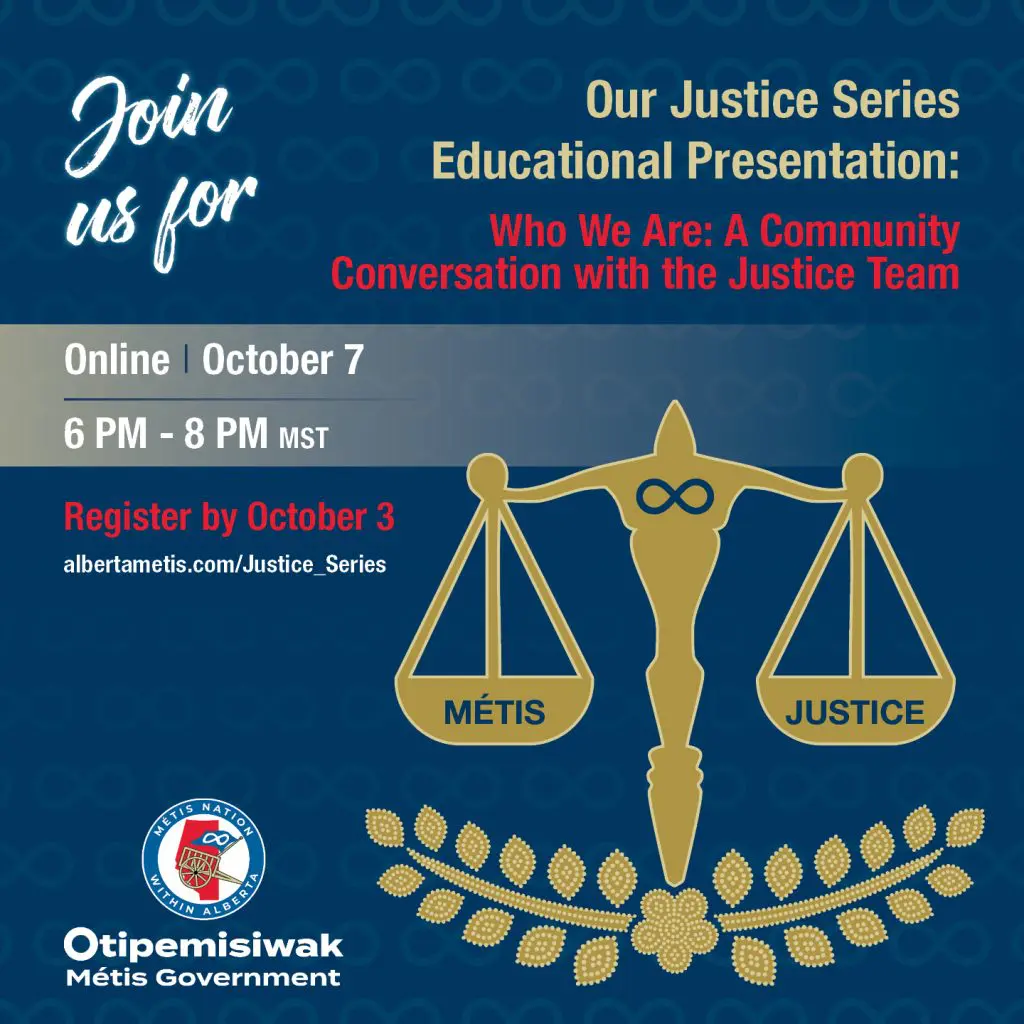 Meet our Justice team! Join us online on October 7 from 6 to 8 p.m. to learn about the support we provide to Métis Albertans involved with the justice system.