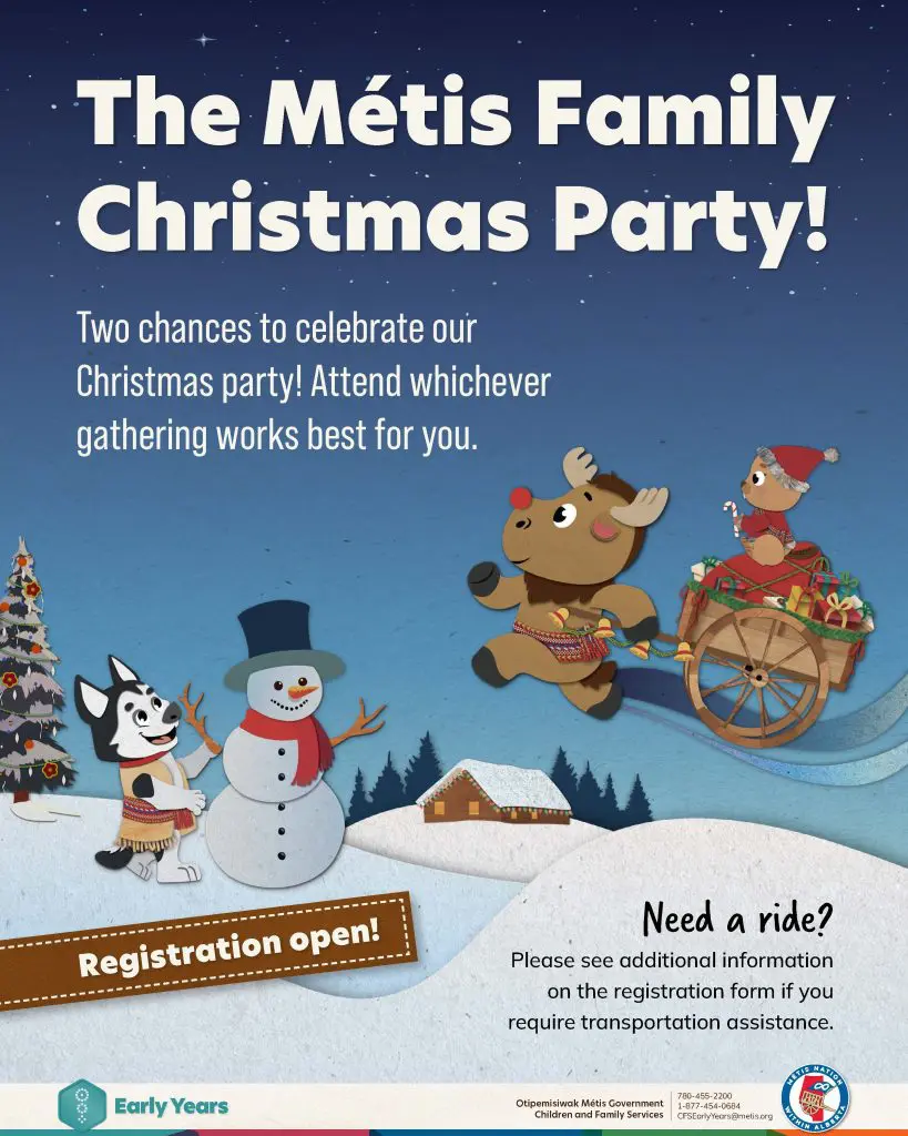 The Métis Family Christmas Party is now happening on Saturday December 6 and Sunday December 7, 2025 at the beautiful Métis Crossing. Bring the whole family and choose the date that works best for you. Enjoy a special visit from Métis Santa, winter activities like tobogganing, snowshoeing, cookie decorating for the little bakers, lively performances by talented Métis musicians, and creative crafts to take home.