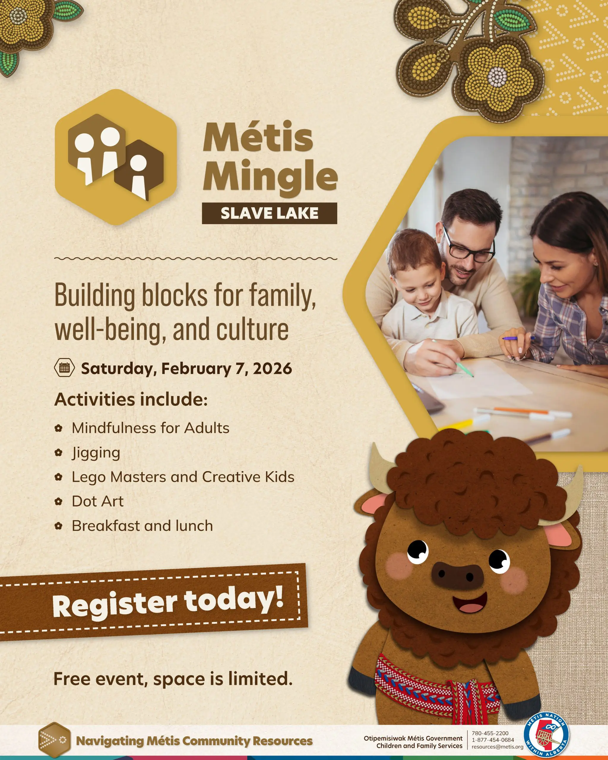 Métis Mingle: Building Blocks for Family, Well-being, and Culture aims to bring together Métis families and knowledge-holders to strengthen family bonds and create lasting memories, while engaging in a variety of awesome workshops to enhance your energy and well-being!