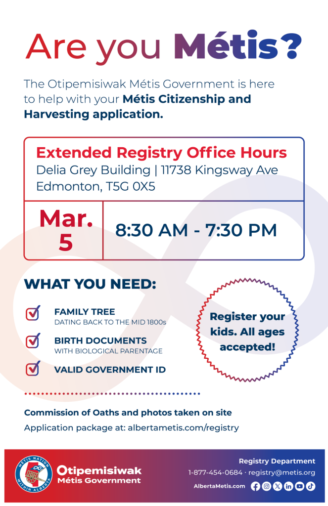 By submitting this form, you are consenting to receive marketing emails from: The Métis Nation of Alberta, 11738 Kingsway Avenue, Edmonton, Alberta, T5G 0X5, Canada, http://albertametis.com. You can revoke your consent to receive emails at any time by using the SafeUnsubscribe® link, found at the bottom of every email. Emails are serviced by Constant Contact.