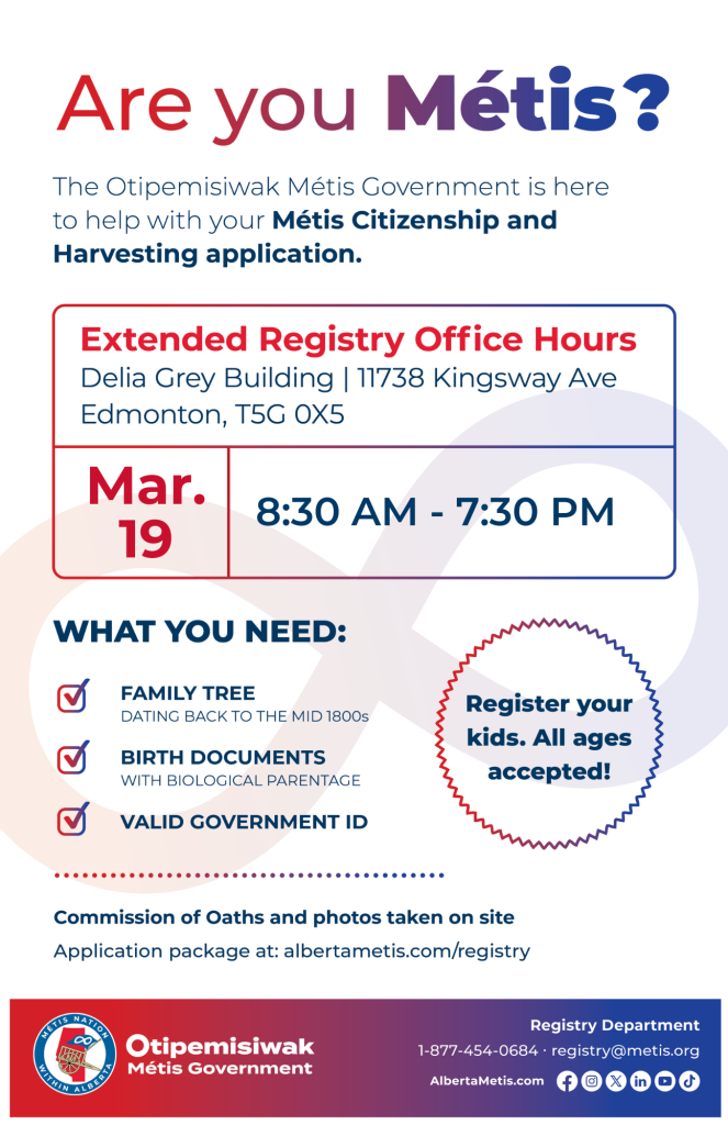 By submitting this form, you are consenting to receive marketing emails from: The Métis Nation of Alberta, 11738 Kingsway Avenue, Edmonton, Alberta, T5G 0X5, Canada, http://albertametis.com. You can revoke your consent to receive emails at any time by using the SafeUnsubscribe® link, found at the bottom of every email. Emails are serviced by Constant Contact.