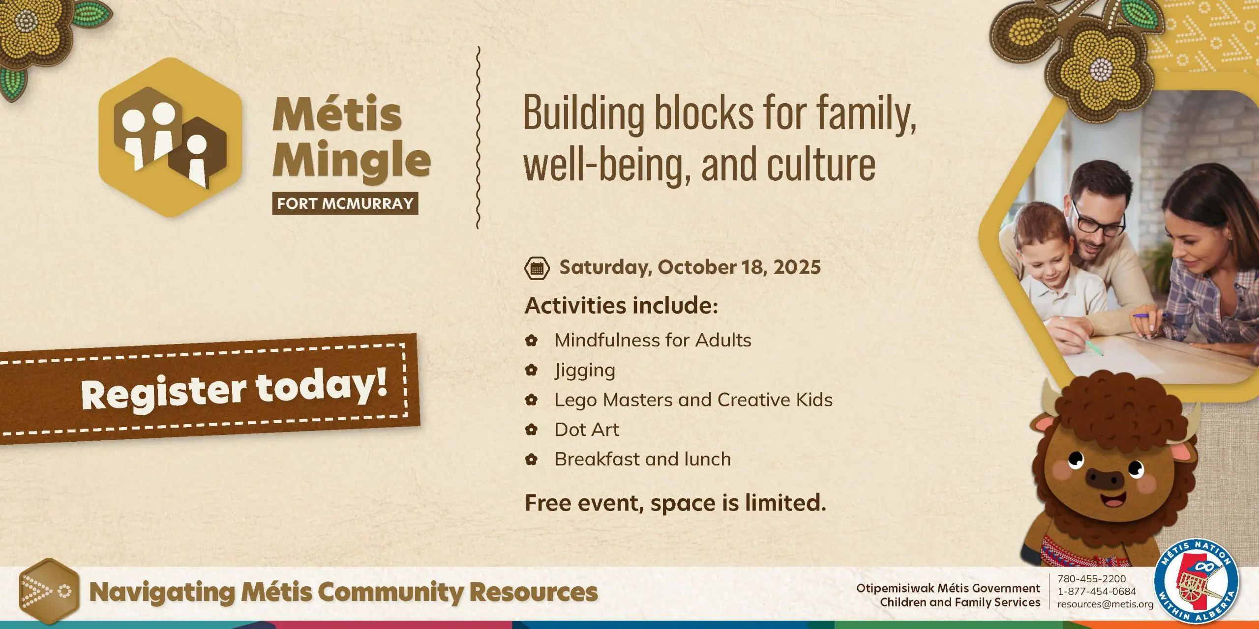 Métis Mingle: Fort McMurray - In Person Event Métis Mingle: Building Blocks for Family, Well-being, and Culture is coming to Alberta! This free event for Métis families with children ages 6–17 offers fun, interactive workshops like mindfulness, jigging, LEGO, and dot art—plus breakfast and lunch included. Workshops for adults and kids run at the same […]
