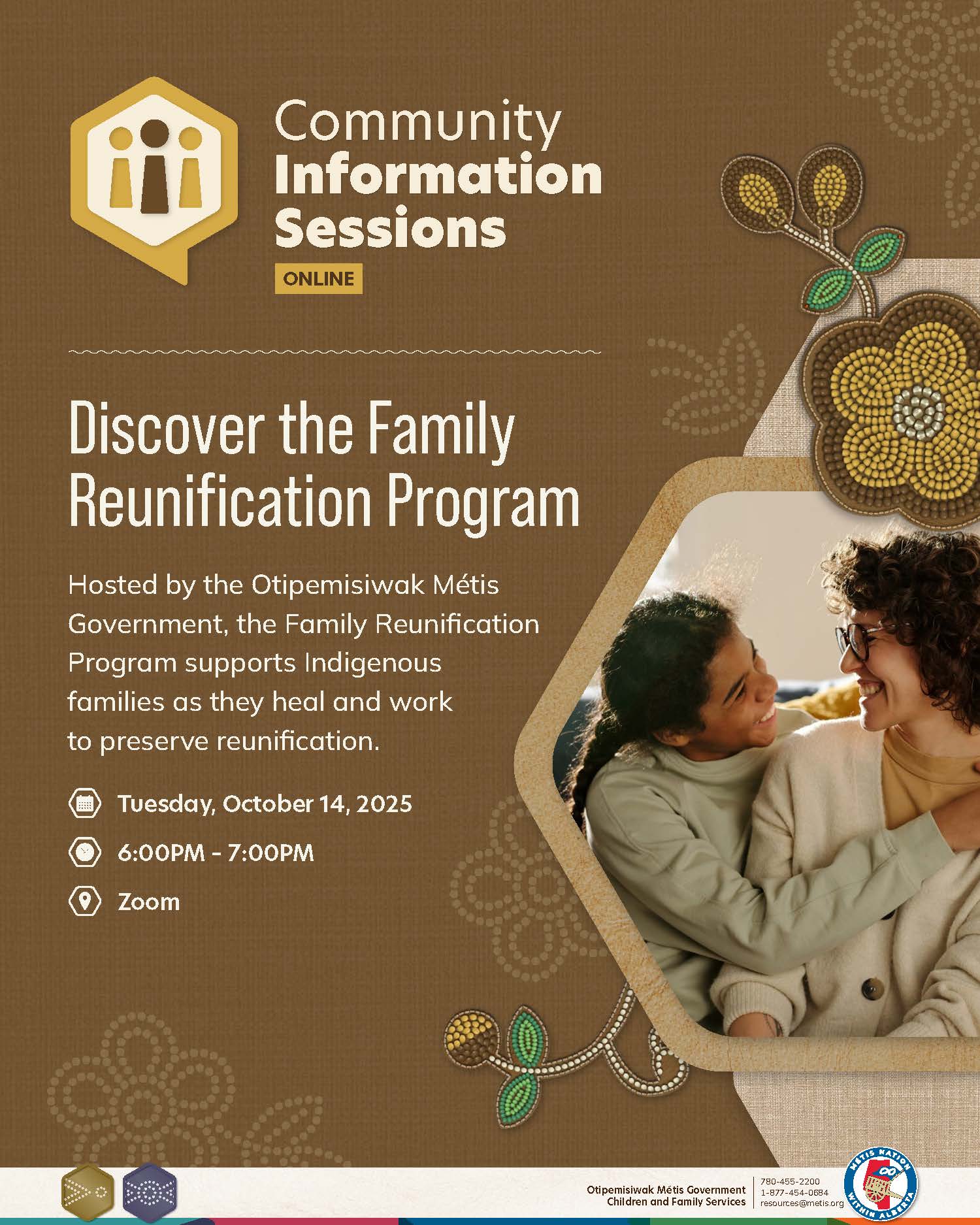 Community Information Session: Supporting Indigenous Families Through Reunification The Family Reunification Program (FRP), offered by the Otipemisiwak Métis Government, is a referral-based program that helps Indigenous parents and guardians reunite with or retain their children in care. By working closely with social workers, housing providers, and community agencies, FRP creates safe, stable pathways for healing, […]