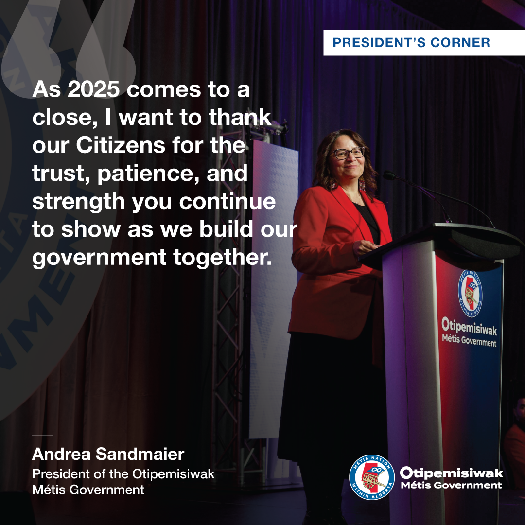 This year marked another important chapter in our journey as the Otipemisiwak Métis Government. We continued the steady, deliberate work of putting our Constitution into action and strengthening the foundations of a modern Métis government. A government that reflects our values, history, and responsibilities we have to one another. That work is not always fast or easy, but it is necessary and being done with care, transparency, and accountability.