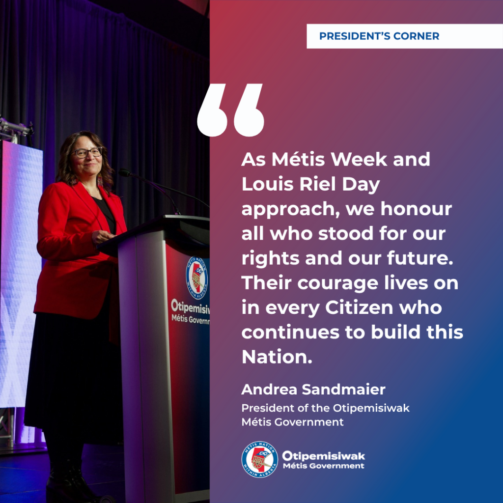 This month also brings Métis Week and Louis Riel Day, a time to remember that our fight for recognition didn’t end with the war, and it didn’t end with Riel. His dream of a self-governing Métis Nation lives in each of us. It lives in our language, music, self-government, and our unshakable belief that Métis people deserve to stand as equals in this country we helped build.