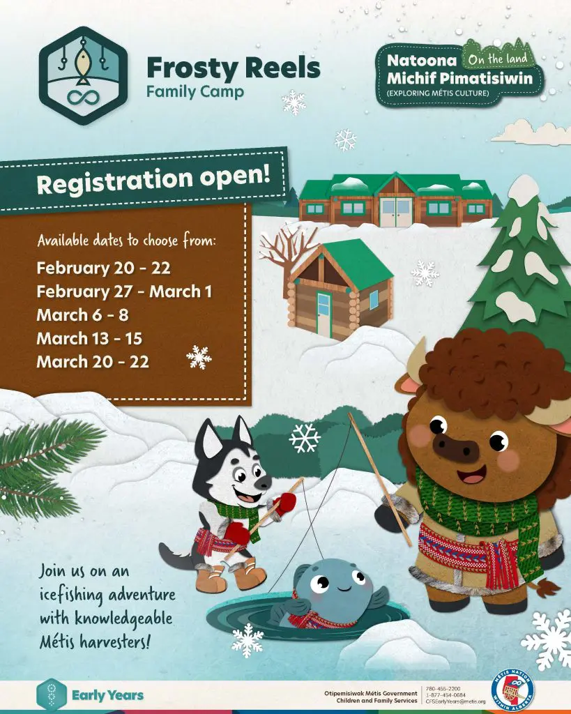 Frosty Reels Family Camp returns this February at Camp Maskepetoon, Pigeon Lake. Bundle up for Métis fun, fishing, and family memories!