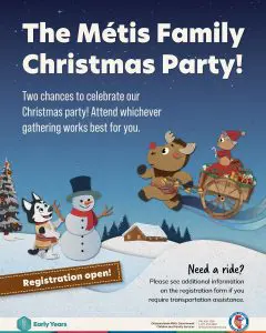The Métis Family Christmas Party is now happening on Saturday December 6 and Sunday December 7, 2025 at the beautiful Métis Crossing.  Bring the whole family and choose the date that works best for you. Enjoy a special visit from Métis Santa, winter activities like tobogganing, snowshoeing, cookie decorating for the little bakers, lively performances by talented Métis musicians, and creative crafts to take home.