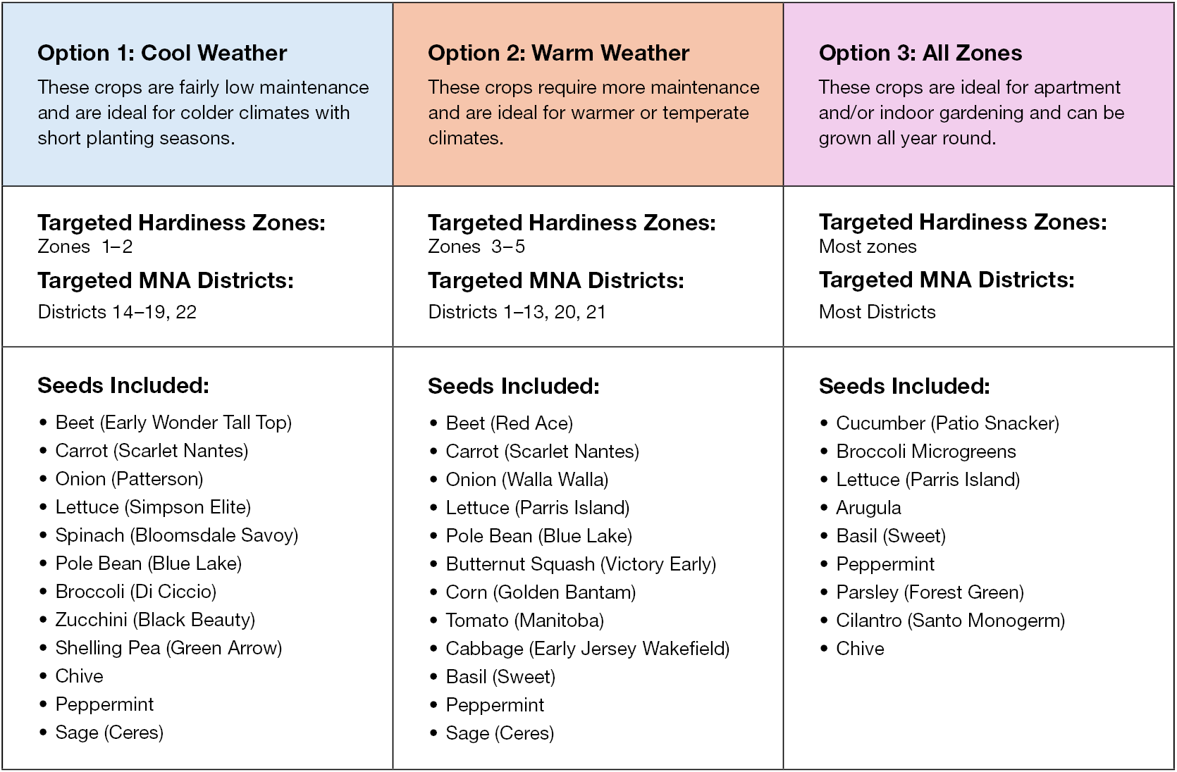 Growing regions, or hardiness zones, vary across the Districts. To ensure your harvest is successful, we’re offering three seed package options that each match specific hardiness zones: