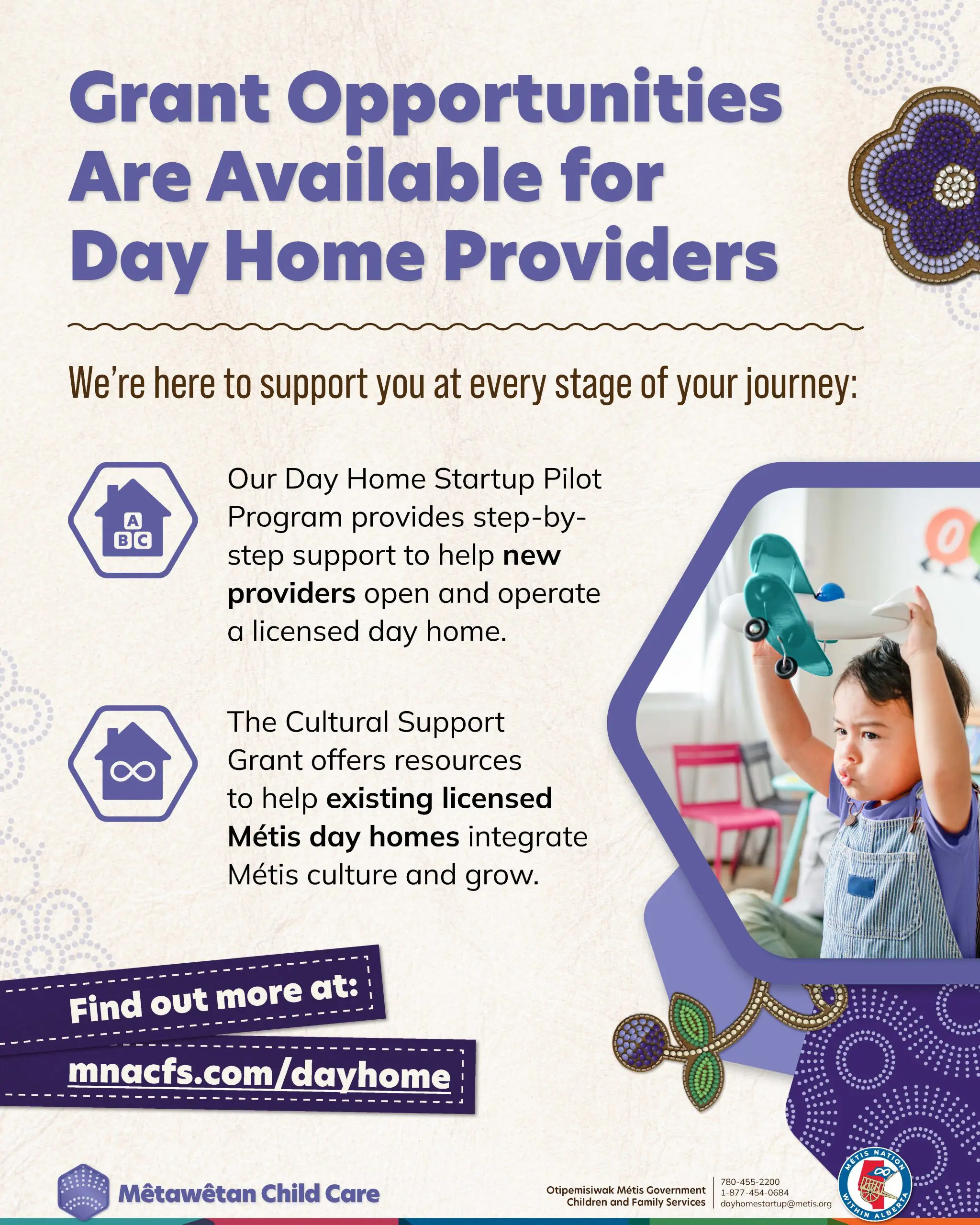 Apply today for the Métis Day Home Cultural Support Grant and you could receive grant funding, a Métis early learning resource kit, and access to ongoing, specialized Métis ECE training!