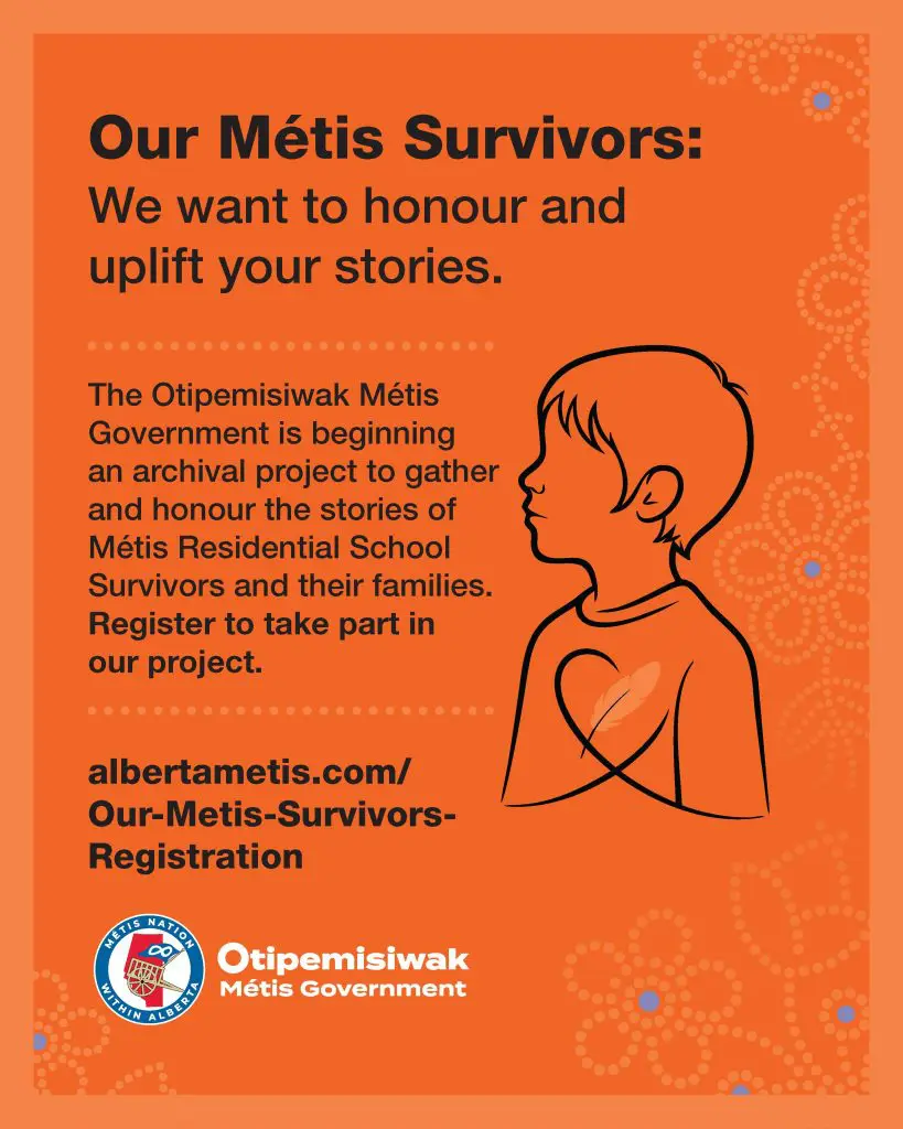 The Otipemisiwak Métis Government is beginning an archival project to gather and honour the stories of Métis Residential School Survivors and Métis Day School Survivors. Through this work, we hope to preserve and share the history our Citizens endured in Canada’s residential school system. This is a history that has deeply impacted our Citizens, and too often they are left out of broader conversations or overlooked.